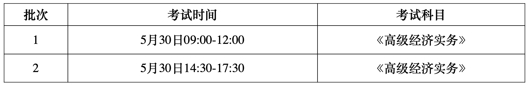 高级经济考试分为2个批次实施。具体考试时间及科目如下: